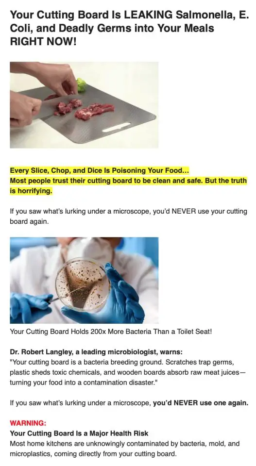 A marketing email making the rounds lately claims that wooden cutting boards are “a bacteria and mold nightmare,” that they raise food-poisoning risk by “up to 200%,” and that a stainless-steel alternative solves the problem. That’s the email ad above and perhaps you’ve seen it. It delivers powerful sales copywriting, but it’s not an honest summary of the evidence at all. The email offers dramatic warnings, but no traceable studies for its biggest claims, plus plenty of claims that are simply not true.