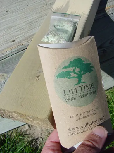 - A completely different approach involves a Canadian product called Lifetime Wood Treatment by Valhalla Wood Products. It comes as a powder you mix with water. When applied to wood the mixture creates an even grey colour by chemical reaction, much as you see on weathered wood only more even and better looking. This is a one-shot proposition, requires no periodic maintenance and is said to enhance rot resistance.
