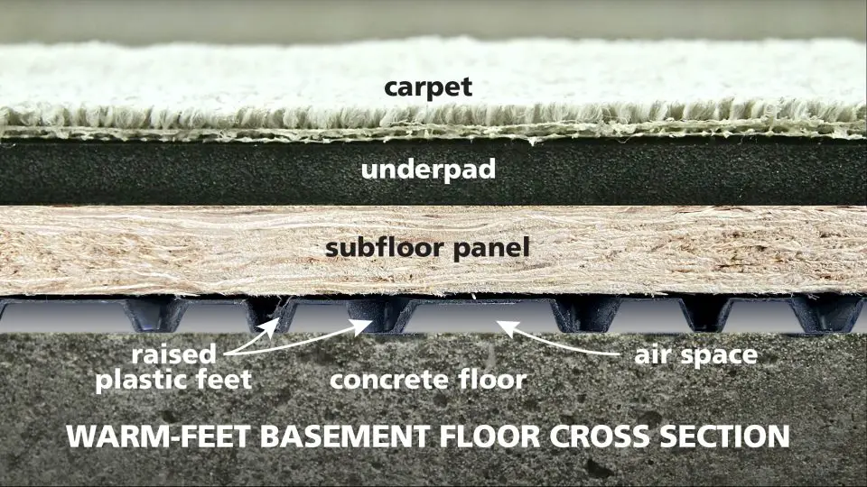 Concrete is cold and if you stand on it long enough you’ll feel cold. This is easy to understand, but puzzling to me because basement floors are still routinely finished with inadequate floor insulation. It never ceases to amaze me how often finished flooring is installed directly on concrete. Besides the mold hazard this leads to, it’s just plain unreasonable to expect warm feet when you’re standing on a finished floor that’s resting directly on that cold concrete. Even carpet on a concrete floor isn’t enough to make your feet feel as warm as they could be. Installing basement subfloor tiles is the simple but often overlooked fix to the lack of insulation problem. Click bere for a detailed teaching video on how to install basement subfloor panels most easily.